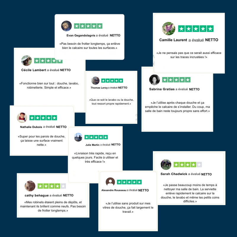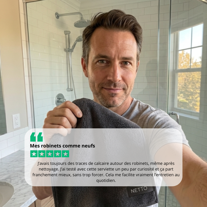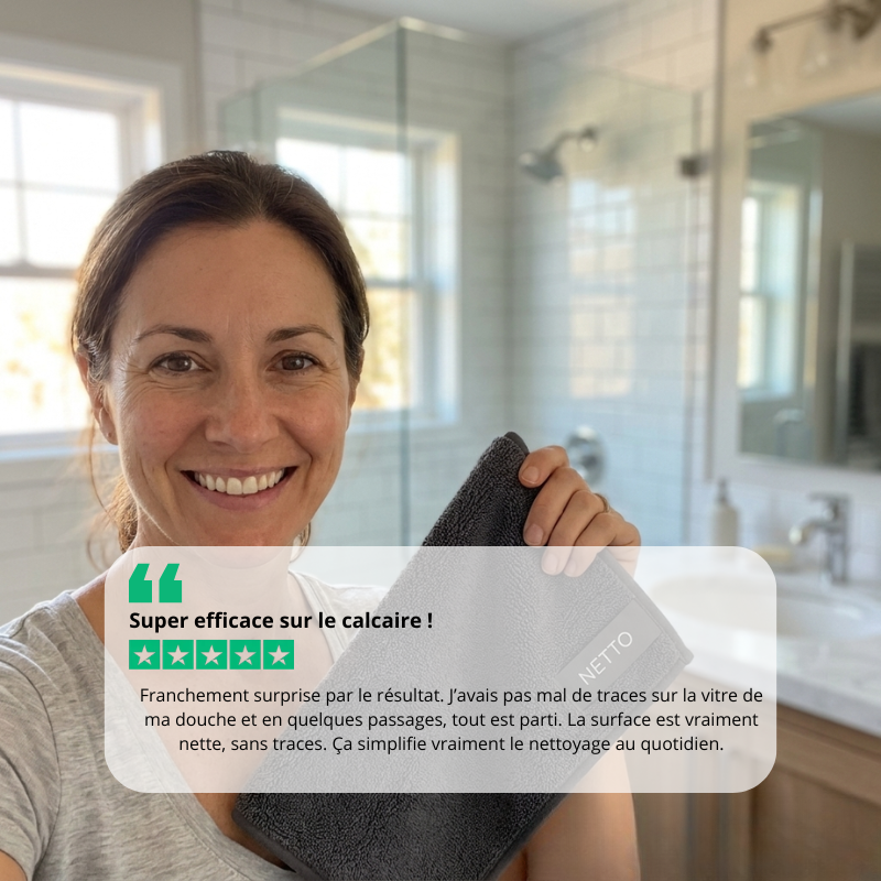 En quelques essuyages rapides, NETTO laisse vos vitres de douche, vos carreaux et vos robinets impeccables sans produits chimiques agressifs, sans traces, sans stress.